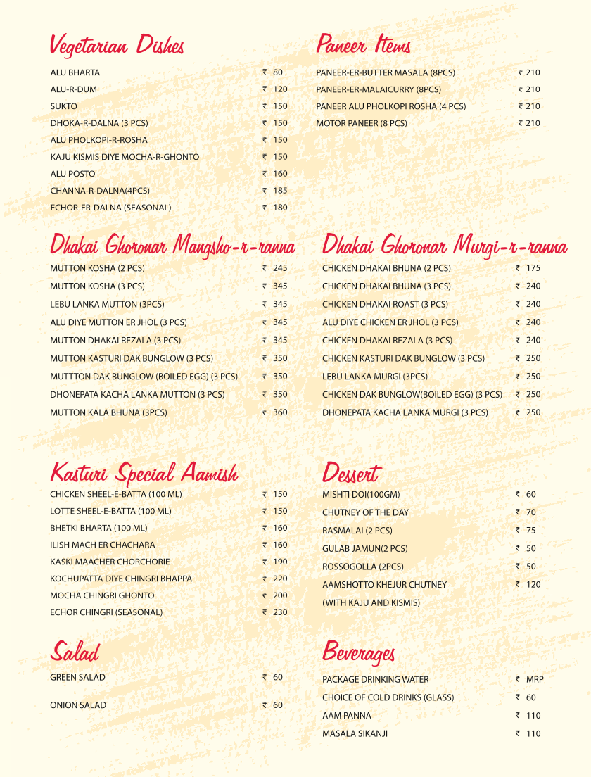 “ Synonym of delicious veg and non veg dishes with authentic bengali taste is KASTURI. ENJOY THE LUNCH AND DINNER TILL LAST BITE. Most appreciable part of this entity are; 1. Ethnic look. 2. Excellent ambient 3. Unforgettable excellent, cooperative & courteous behavior of staff And last but not the least part is online coupled offline delivery system. Enjoy the luxury of taste within a pocket friendly budget. ”